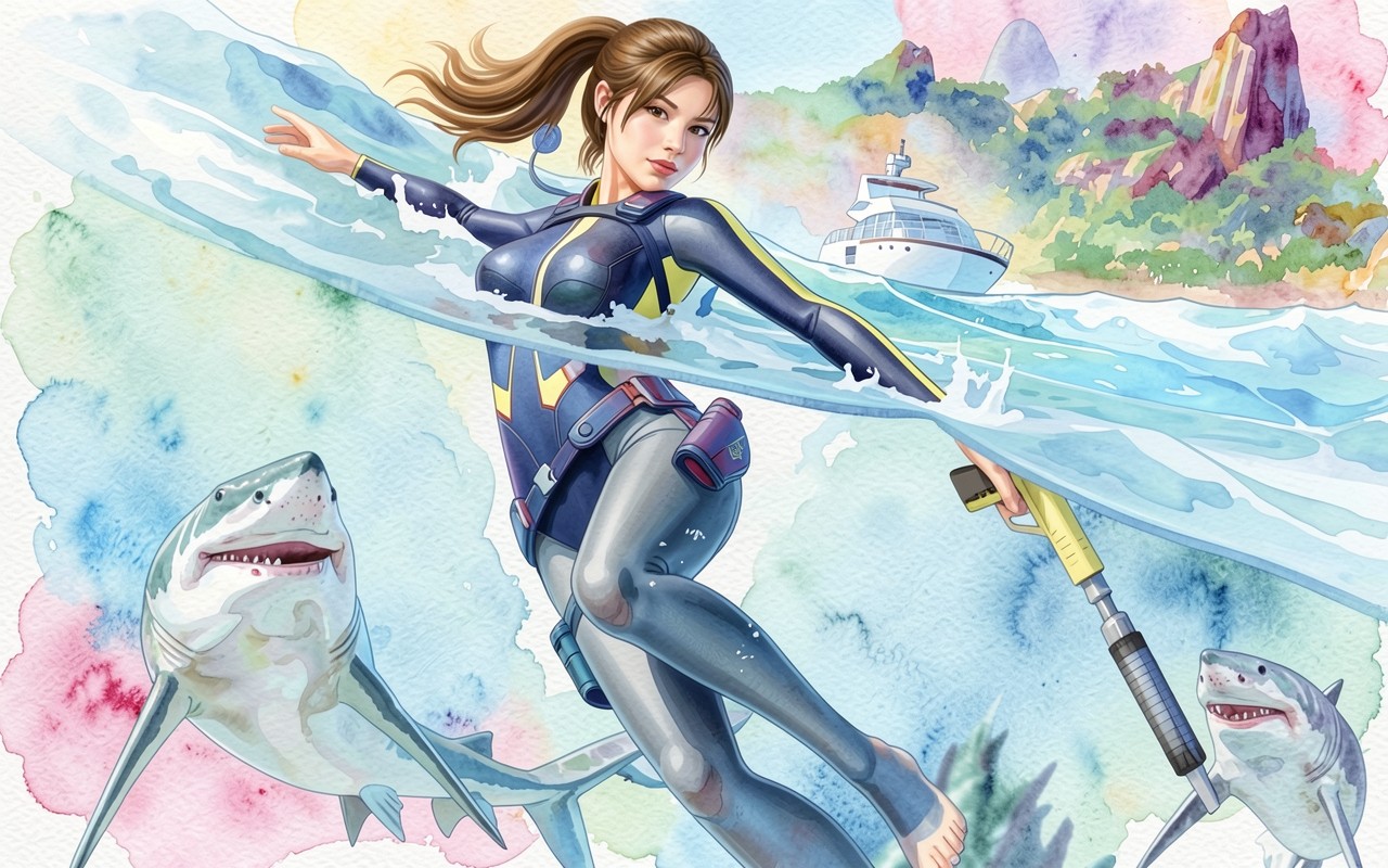 Девушка в гидрокостюме с акулами акварельный стиль