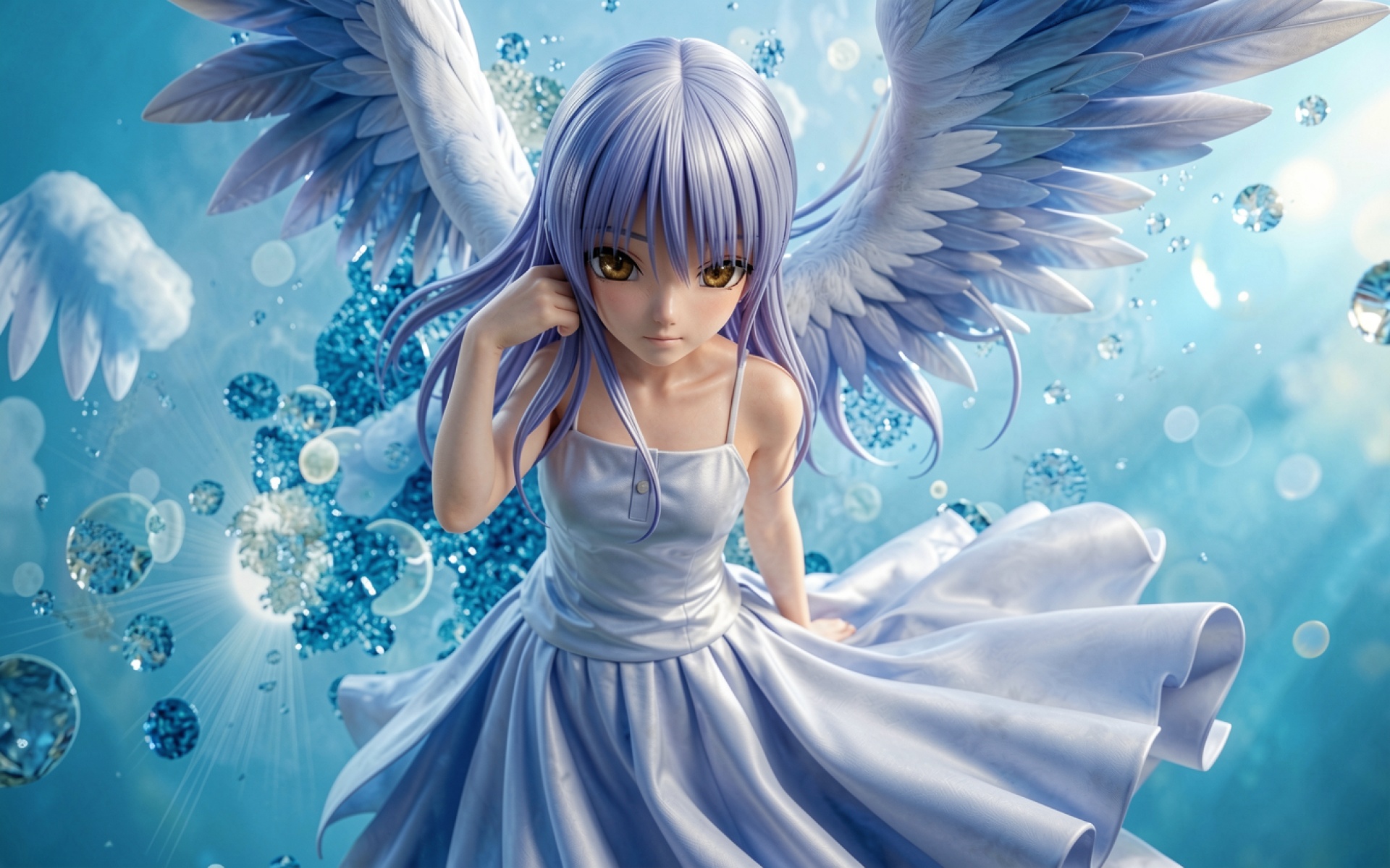 Девушка ангел с фиолетовыми волосами в голубом платье