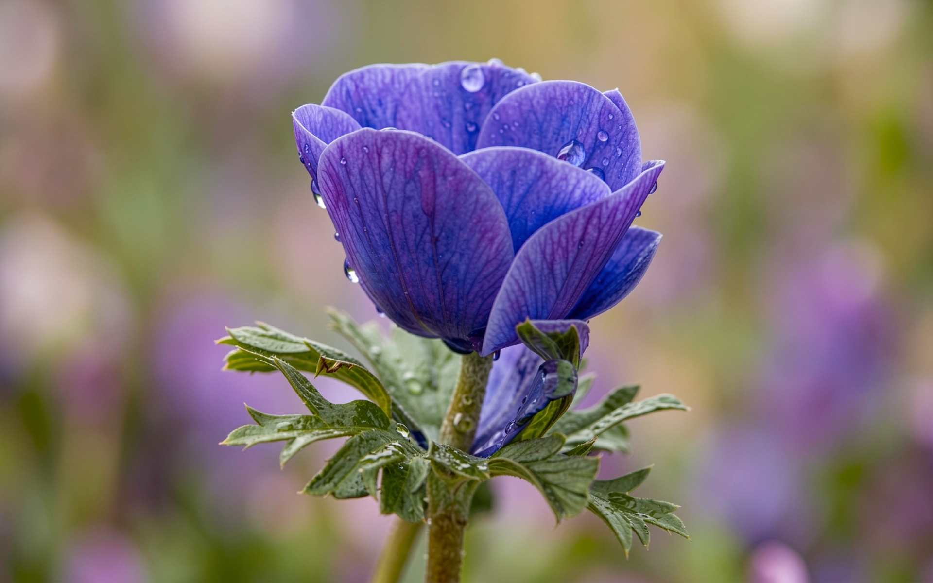 Синий цветок анемона с каплями росы