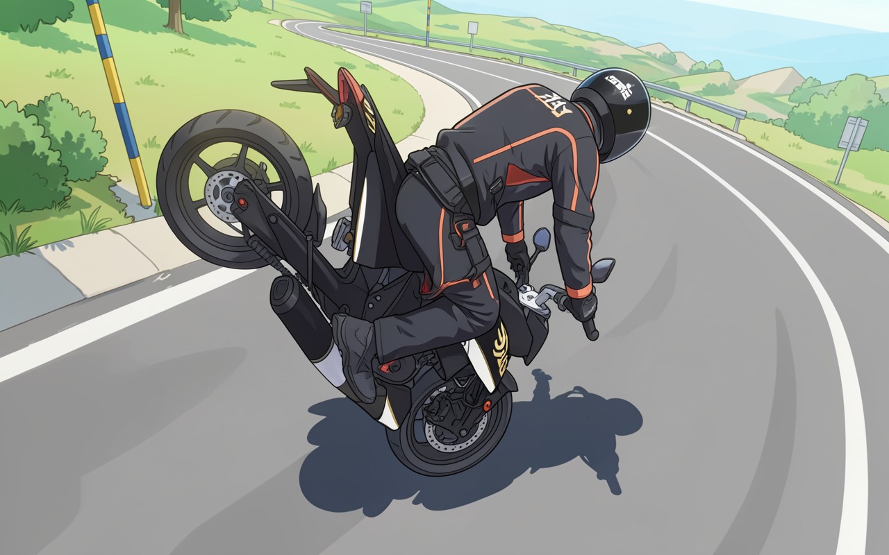 Мотоциклист в черном костюме на серый асфальт