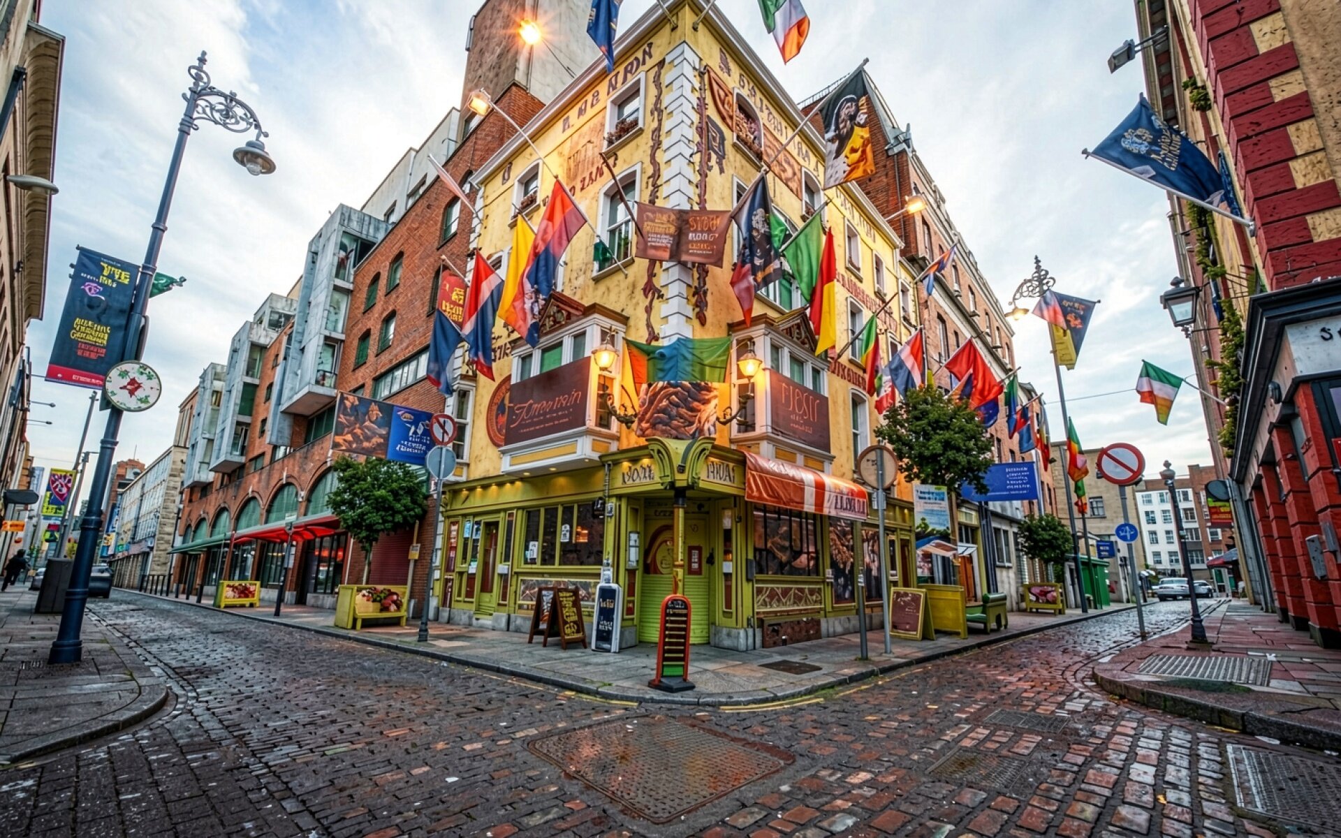 Улица Темпл Бар в Дублине с флагами