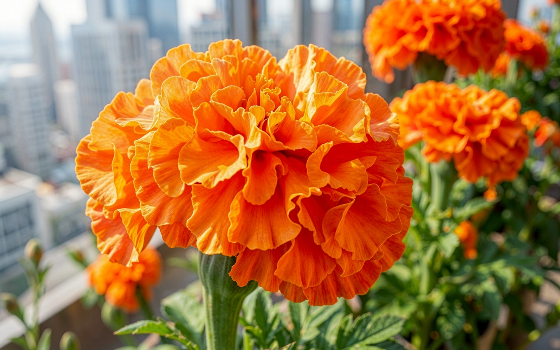 Оранжевая бархатная бархатца на фоне городского пейзажа