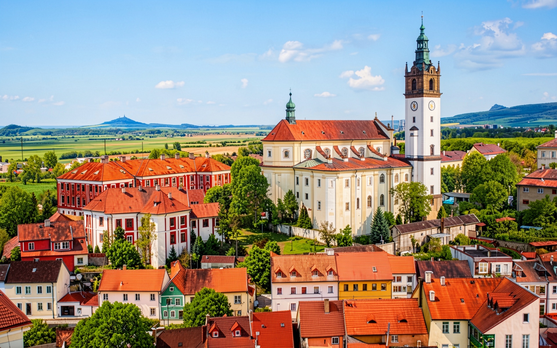 Панорама города с белой церковью и башней