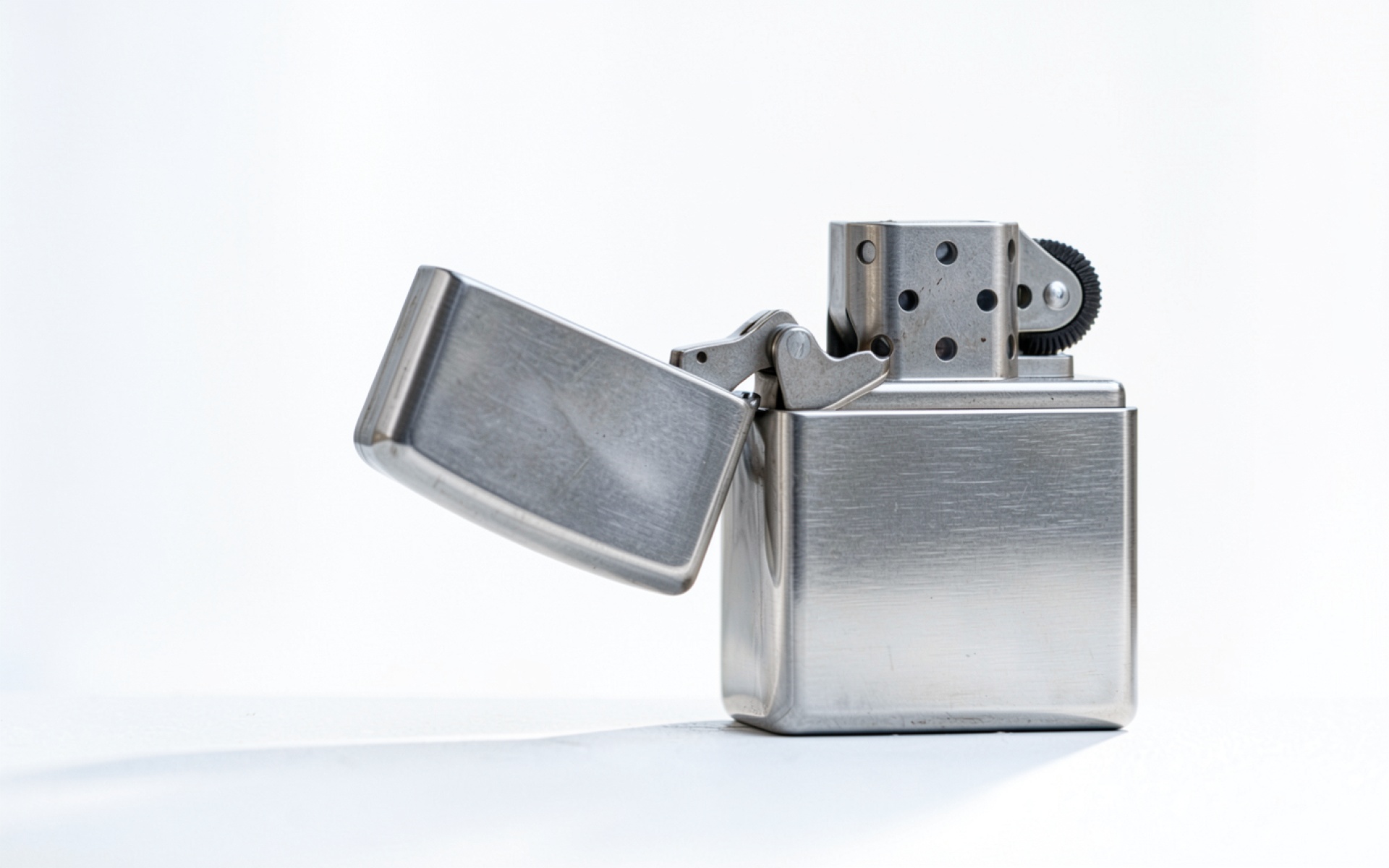 Стальной бензиновый зажигалка в минималистичном белом интерьере