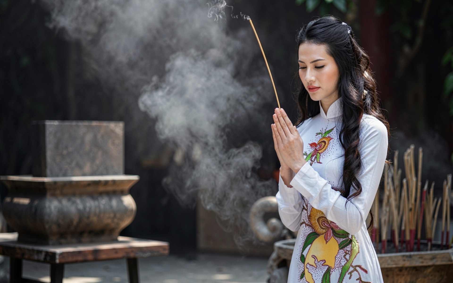 Девушка в белом аозай с благовониями