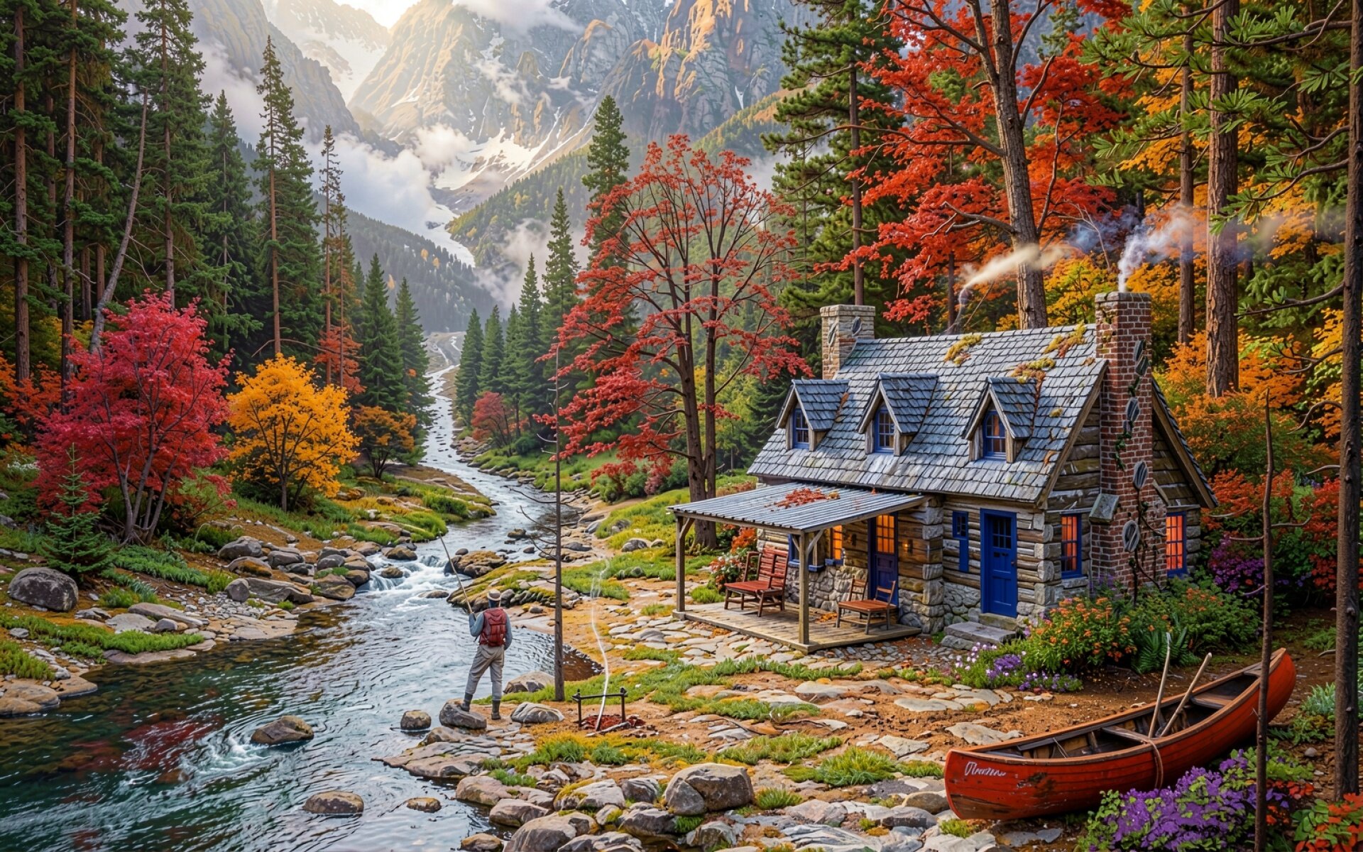 Уютный бревенчатый дом в осеннем хвойном лесу