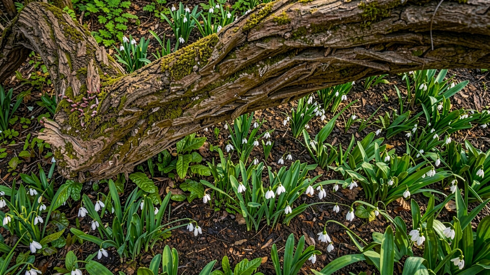 Белые подснежники у старого мшистого бревна