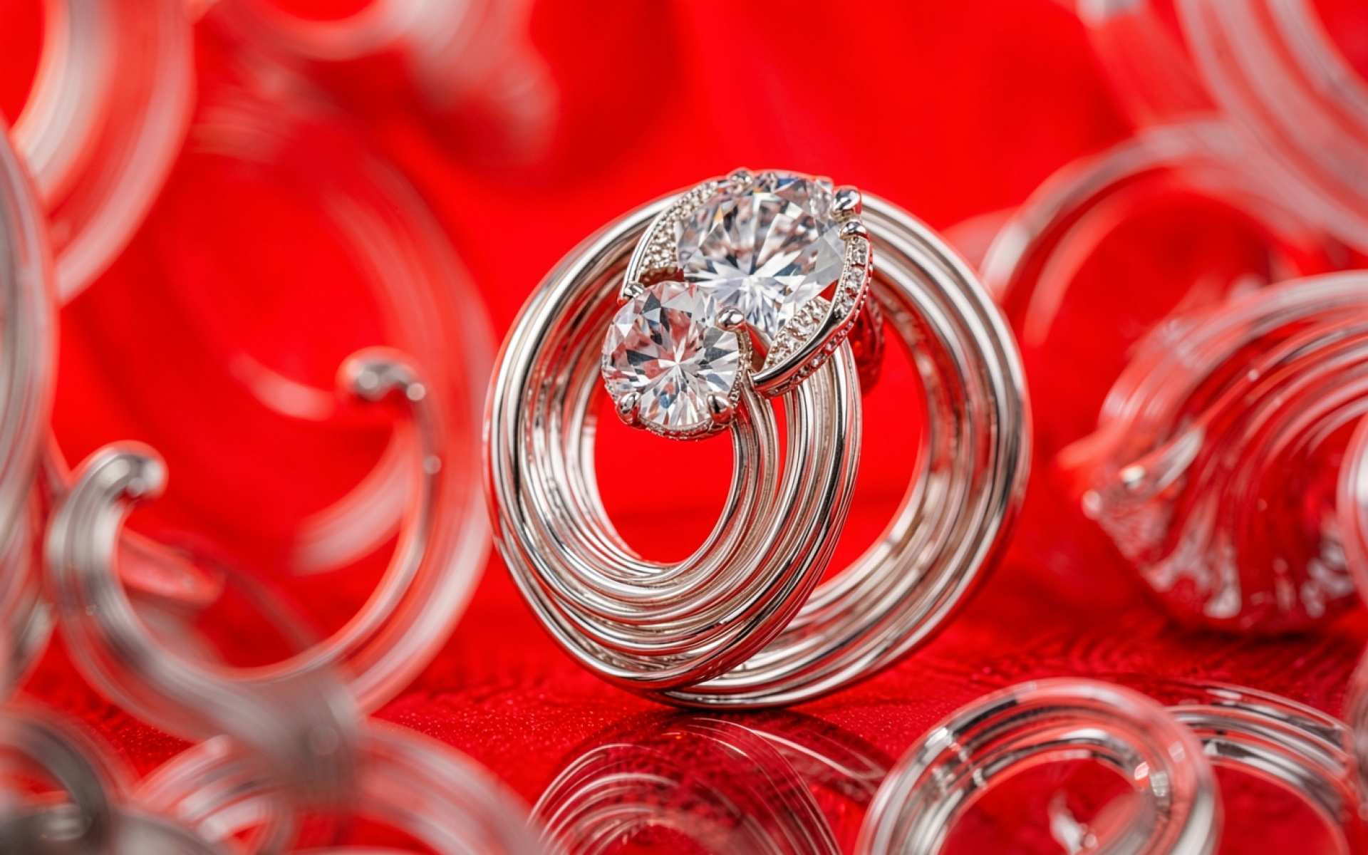 Серебряное кольцо с бриллиантами на красном фоне