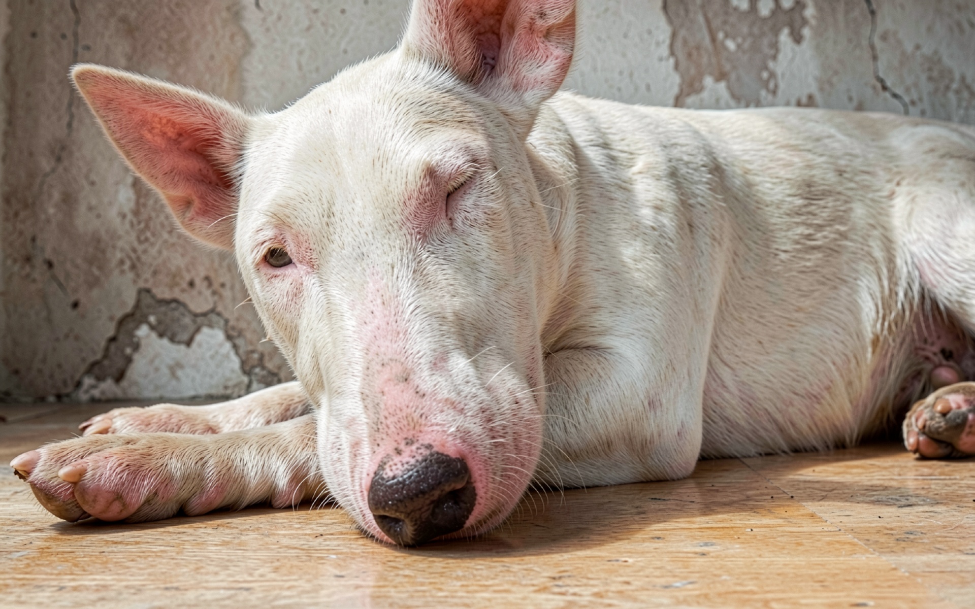Белый английский бультерьер на деревянном полу