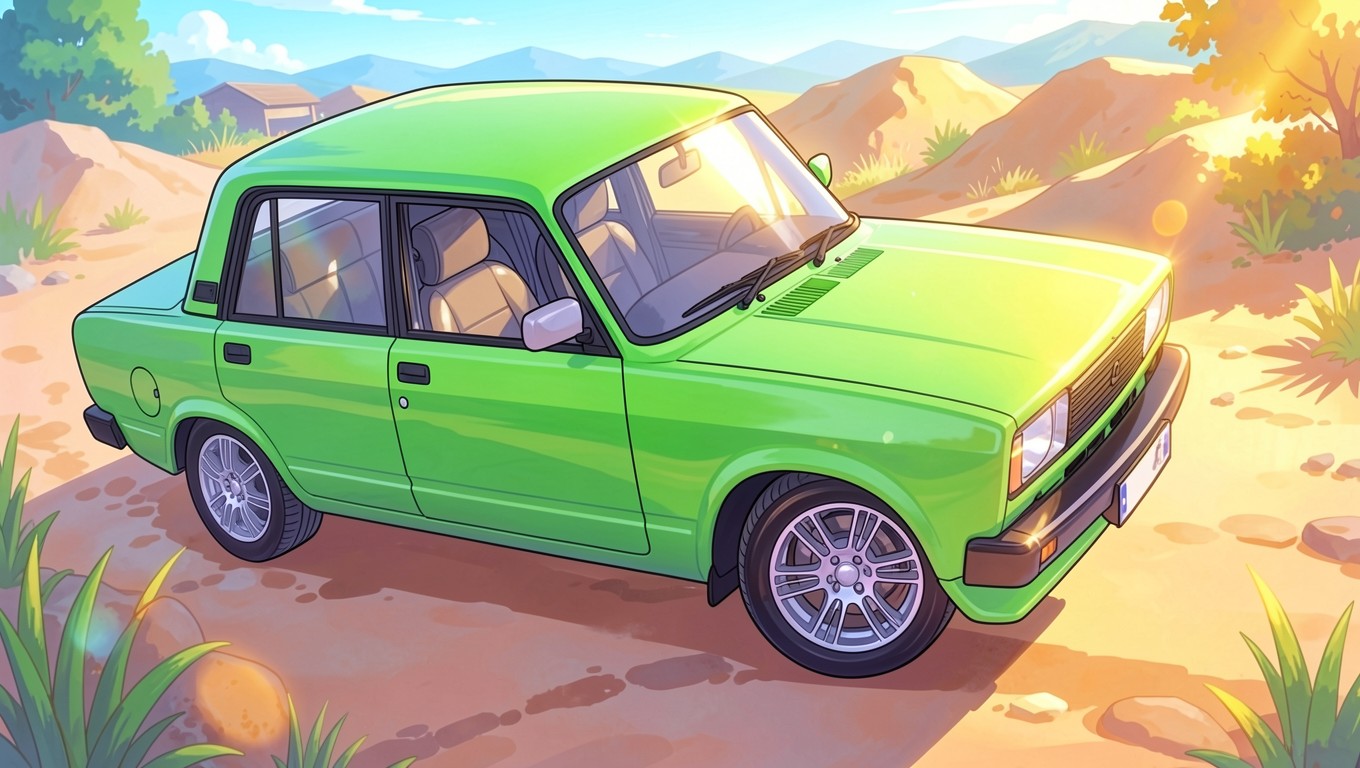 Зеленый автомобиль ВАЗ в солнечном горном пейзаже