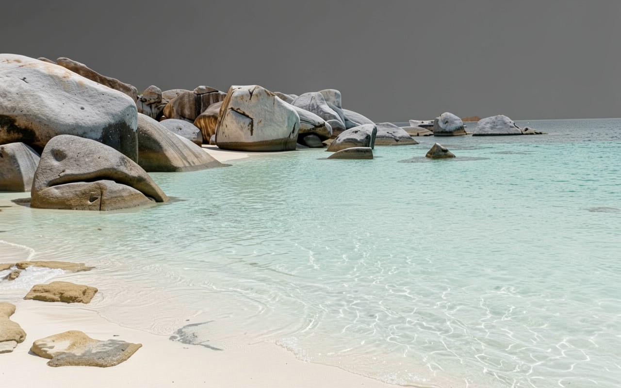 Серые гранитные валуны на бирюзовом пляже