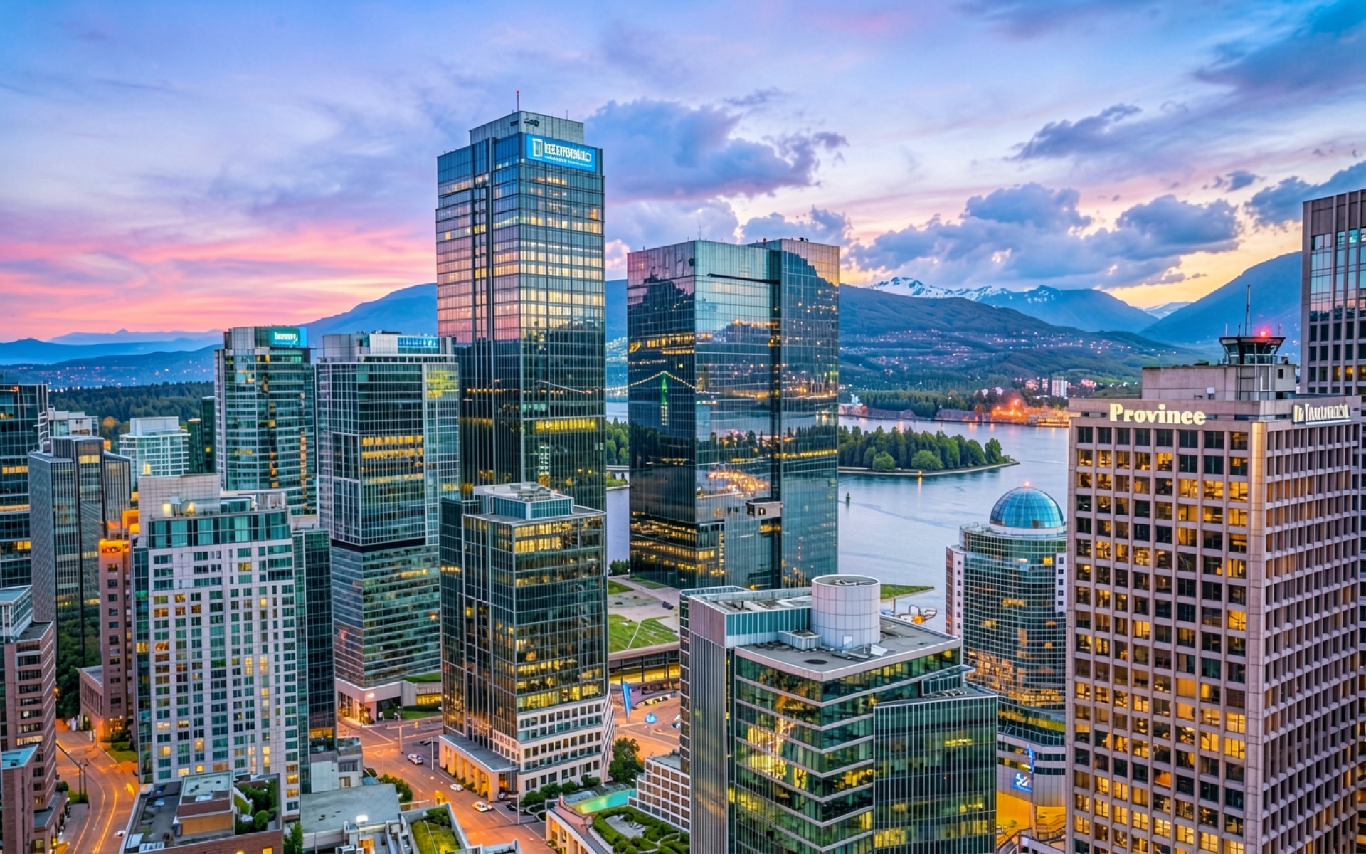 Панорама небоскребов Ванкувера в розовых закатных тонах