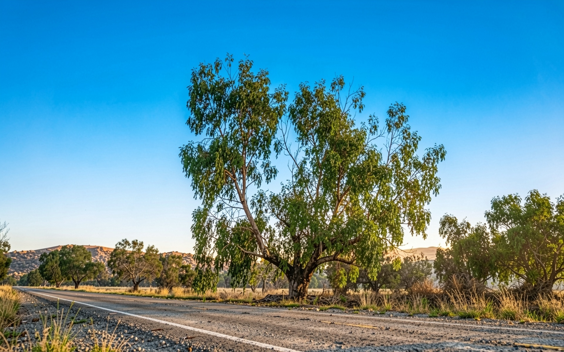Одинокое дерево эвкалипт вдоль засушливой дороги
