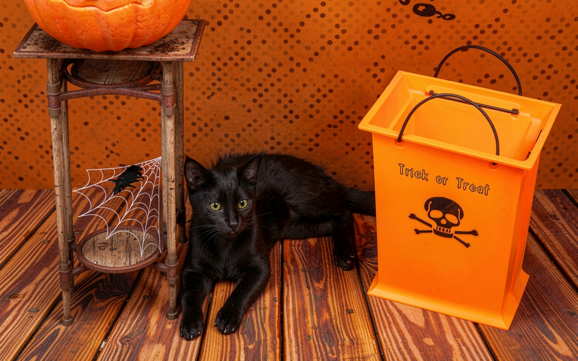 Черный кот рядом с оранжевым ведром Хэллоуина