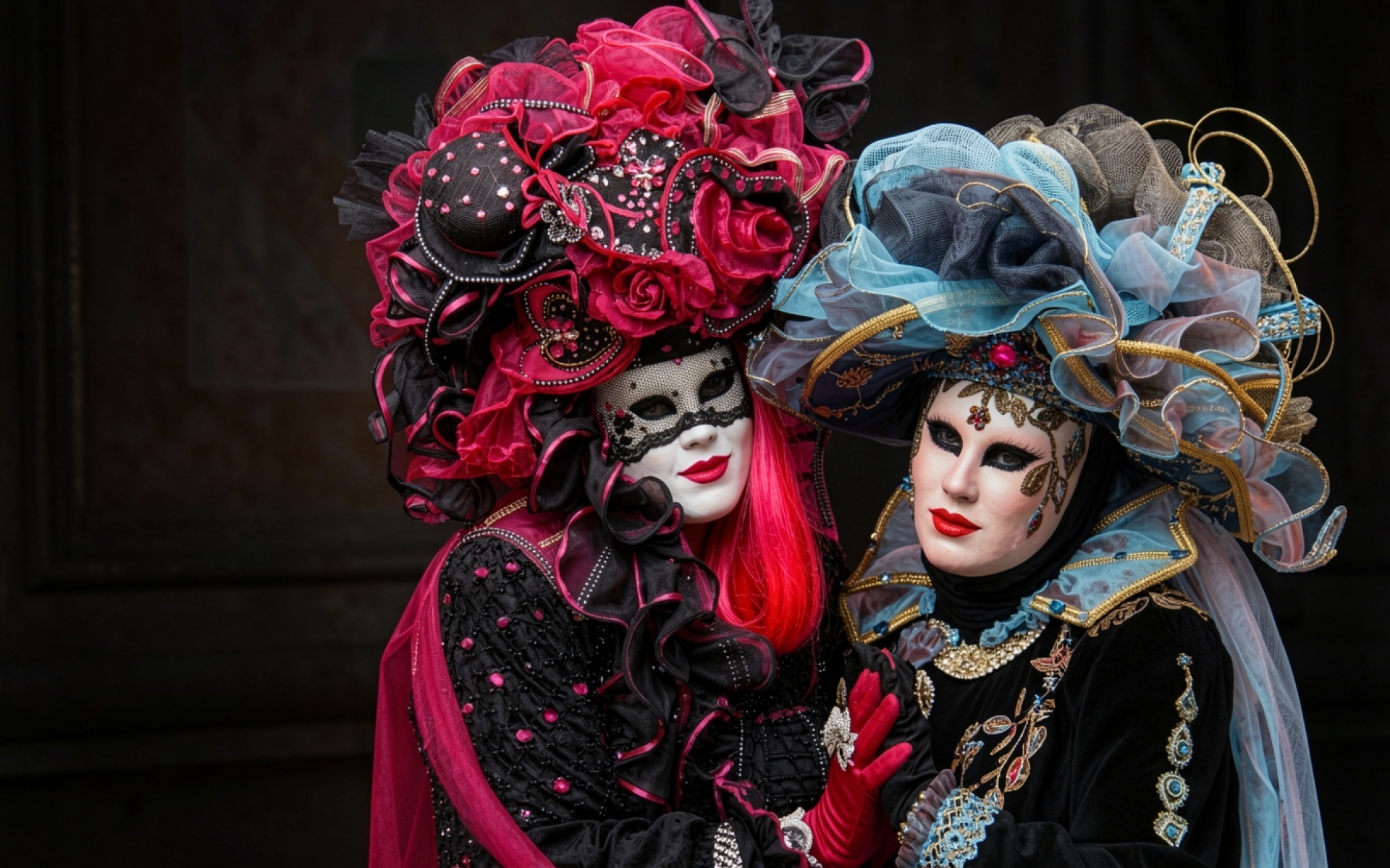 Венецианские маски в красном и синем нарядах