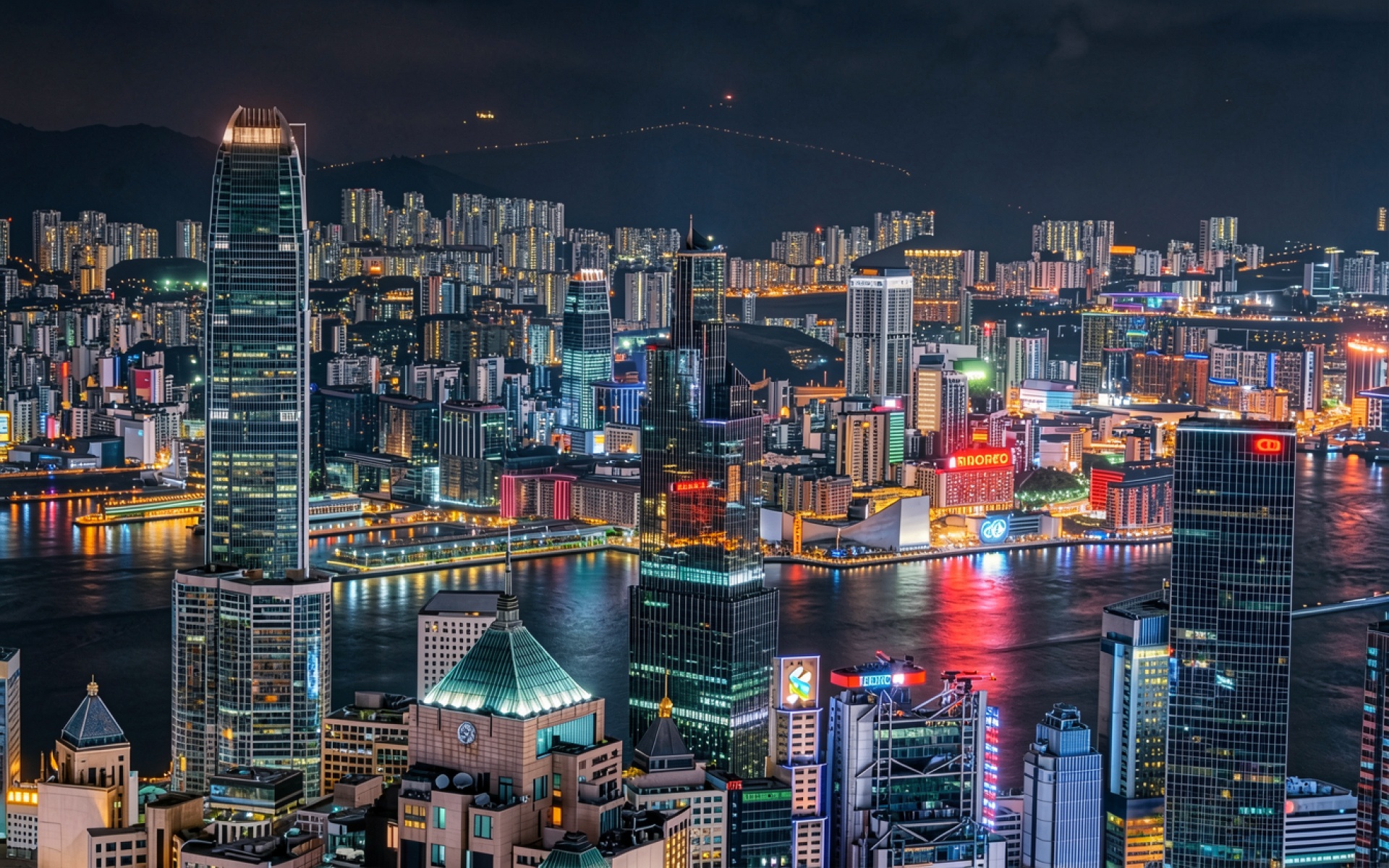 Ночной панорамный вид города с неоновыми огнями