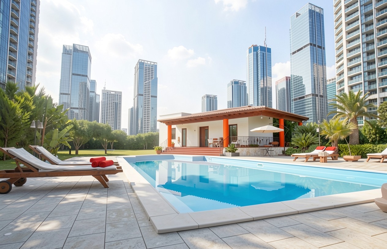 Голубой бассейн у виллы среди небоскребов