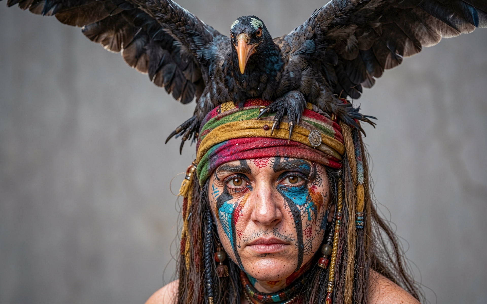 Шаман с черным вороном в этническом стиле