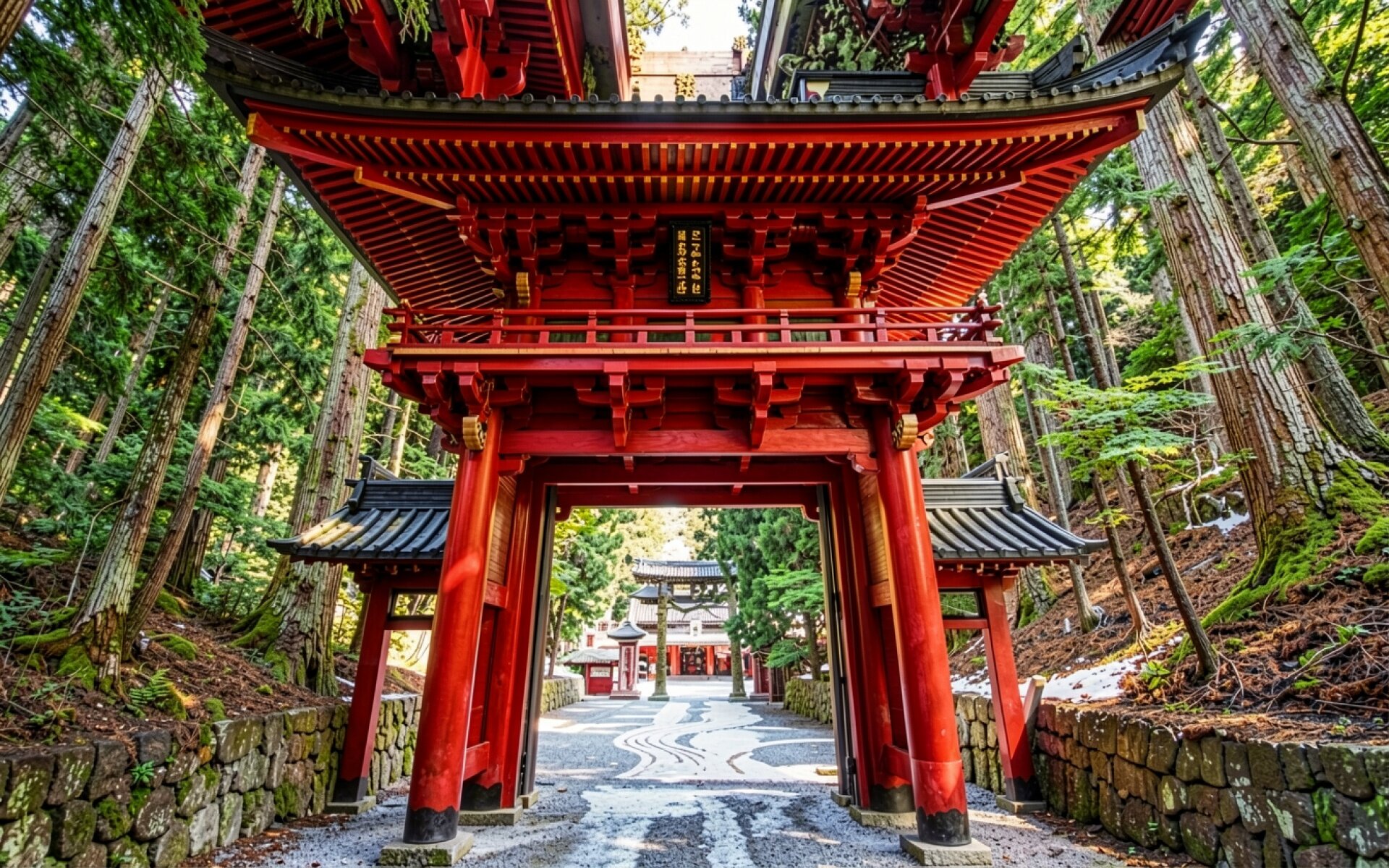 Красные ворота синтоистского храма в хвойном лесу