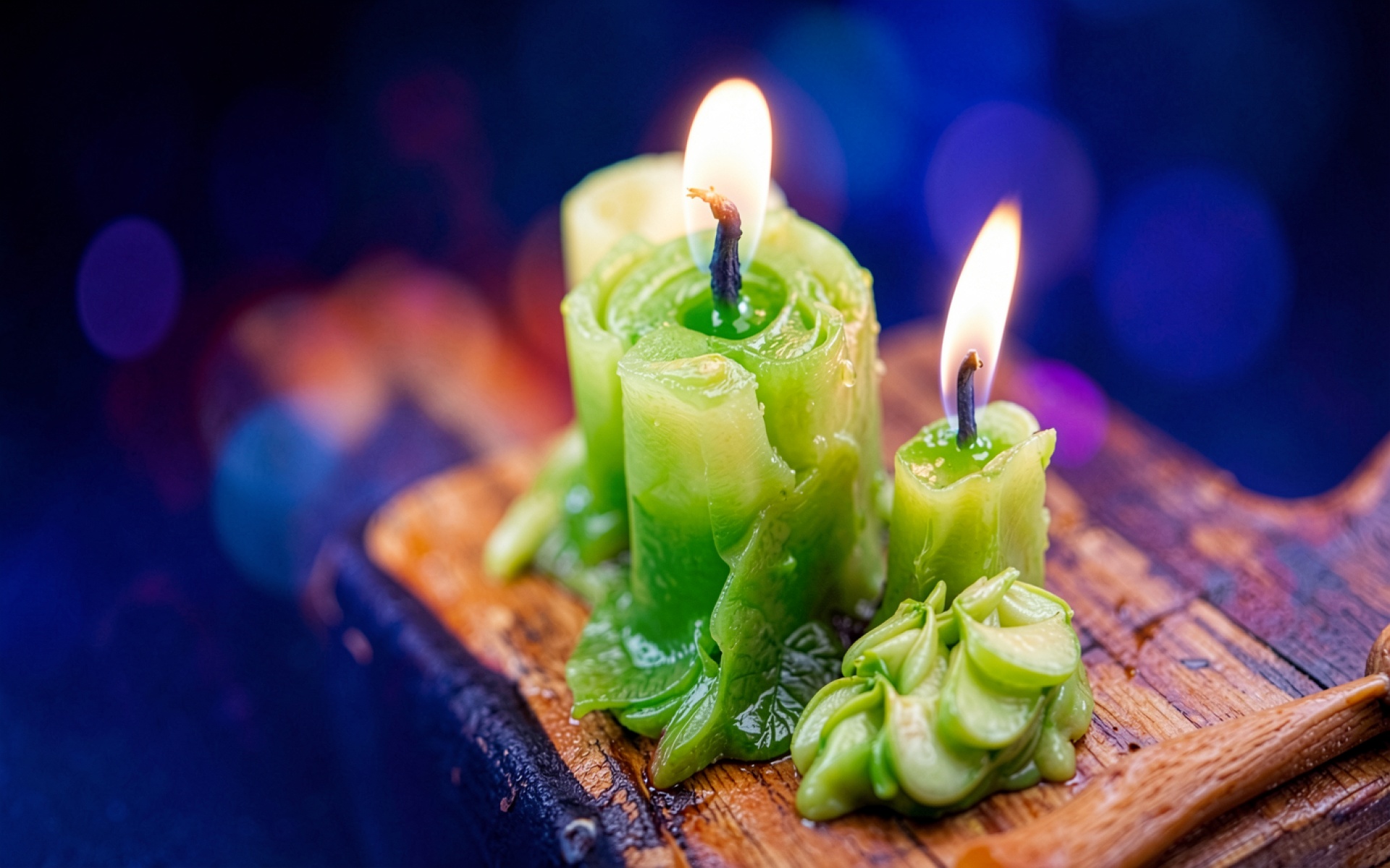 Зеленые восковые свечи на деревянной доске