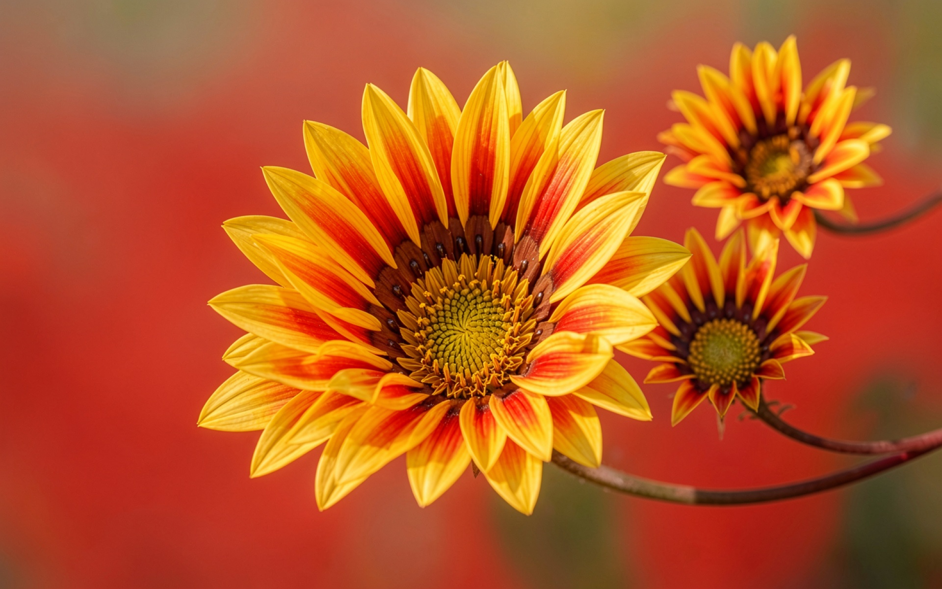 Желтые цветы газании на красном фоне