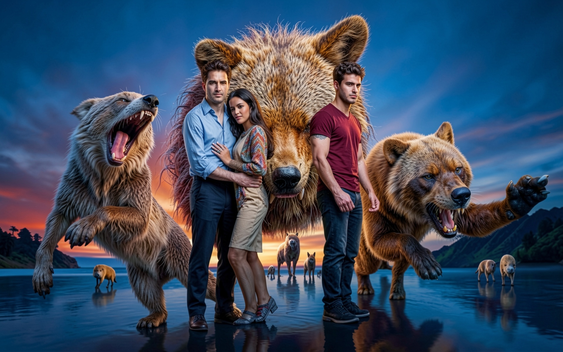 Люди и гигантские волки в сумерках