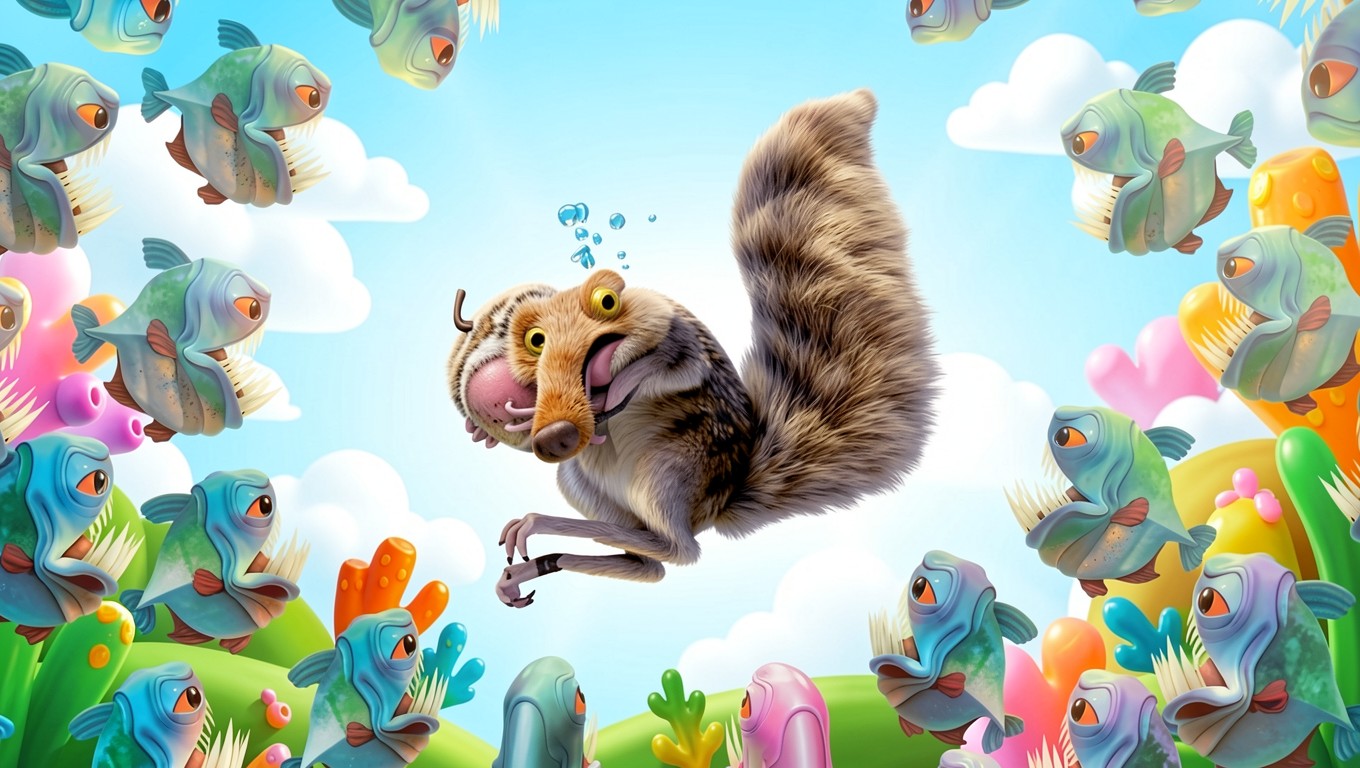 Белка Скрат в окружении глубоководных рыб