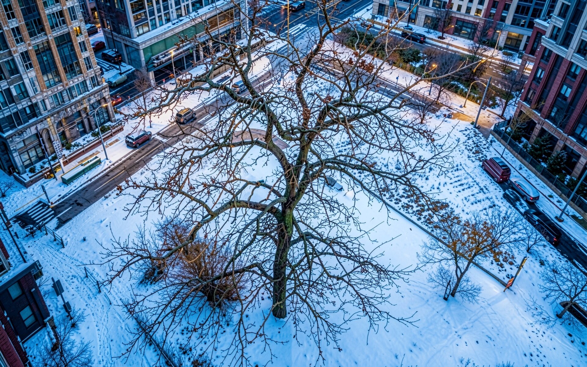 Зимний город с голым деревом сверху