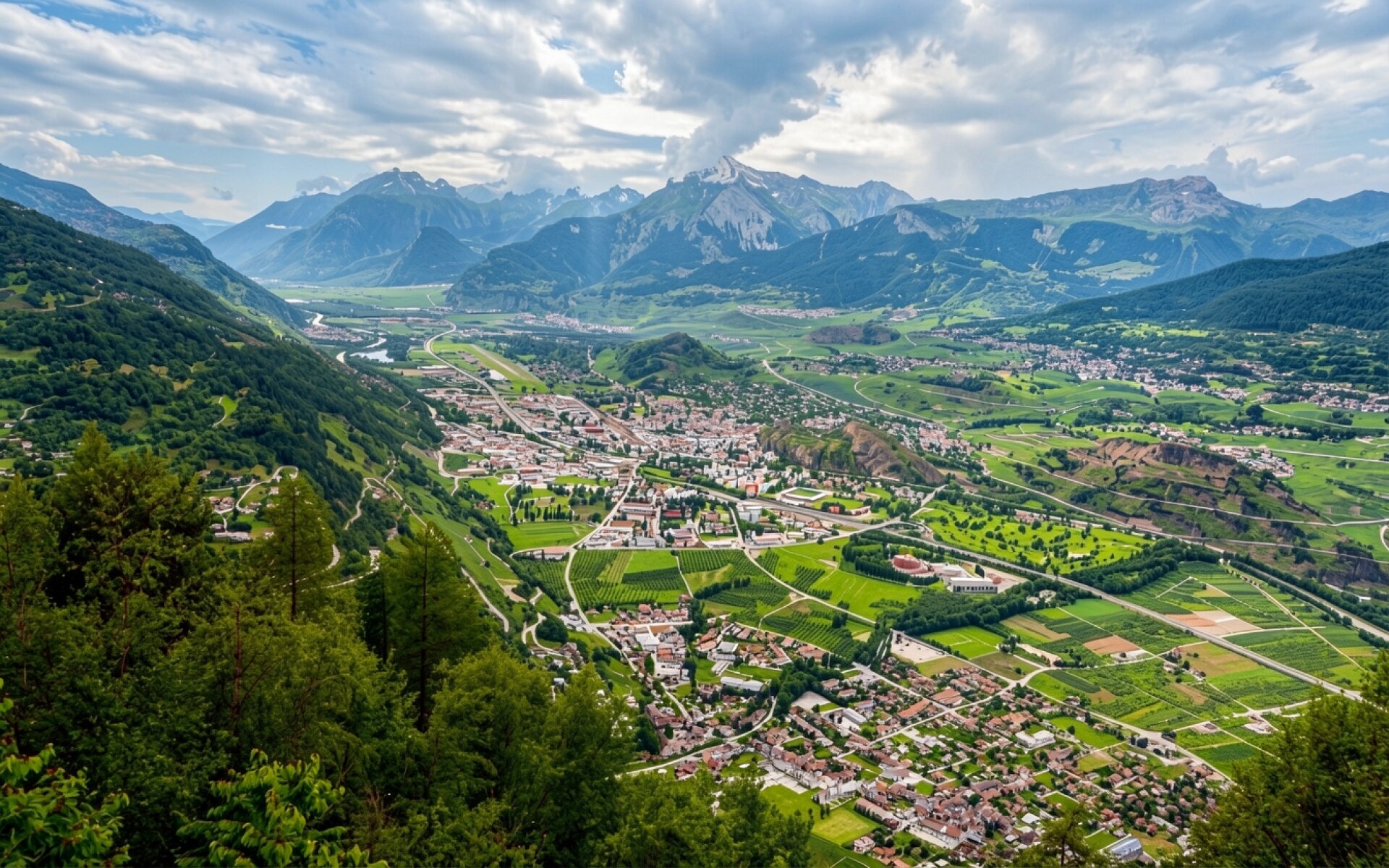 Панорама горного города в зеленой долине