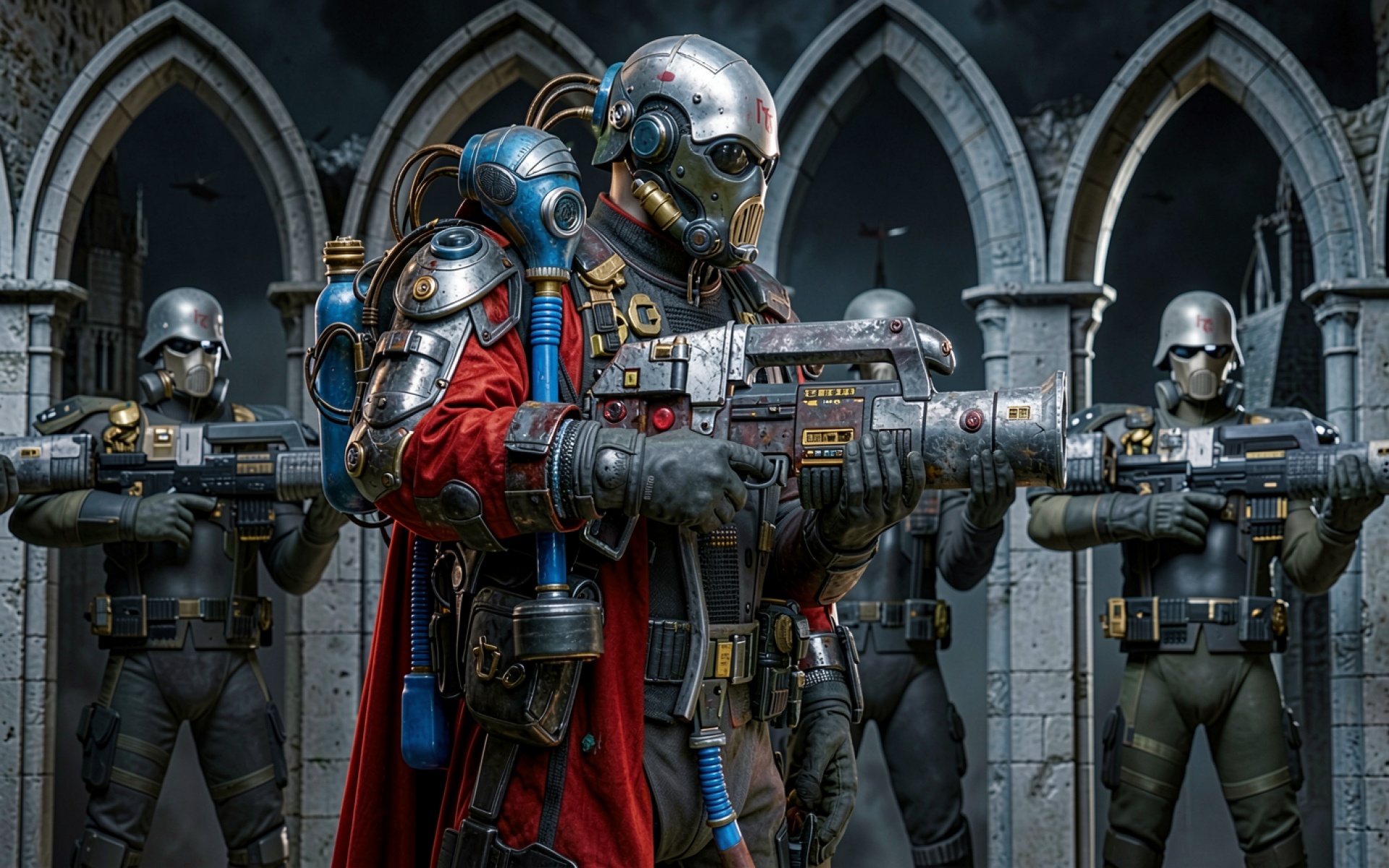 Футуристический солдат в красном плаще среди готических арок