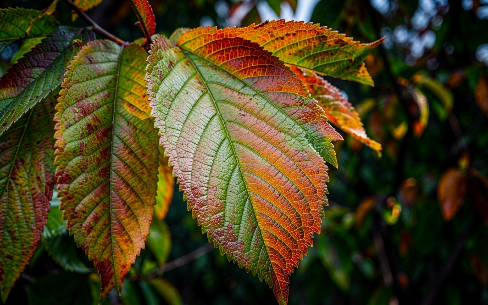 Осенние листья граба в темном лесу