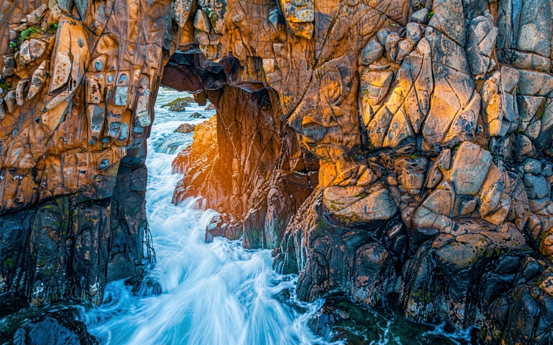 Морская пещера оранжевый гранит белый прибой