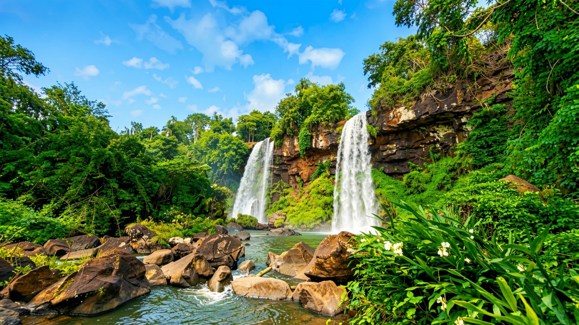 Двойной водопад в тропическом лесу при дневном свете