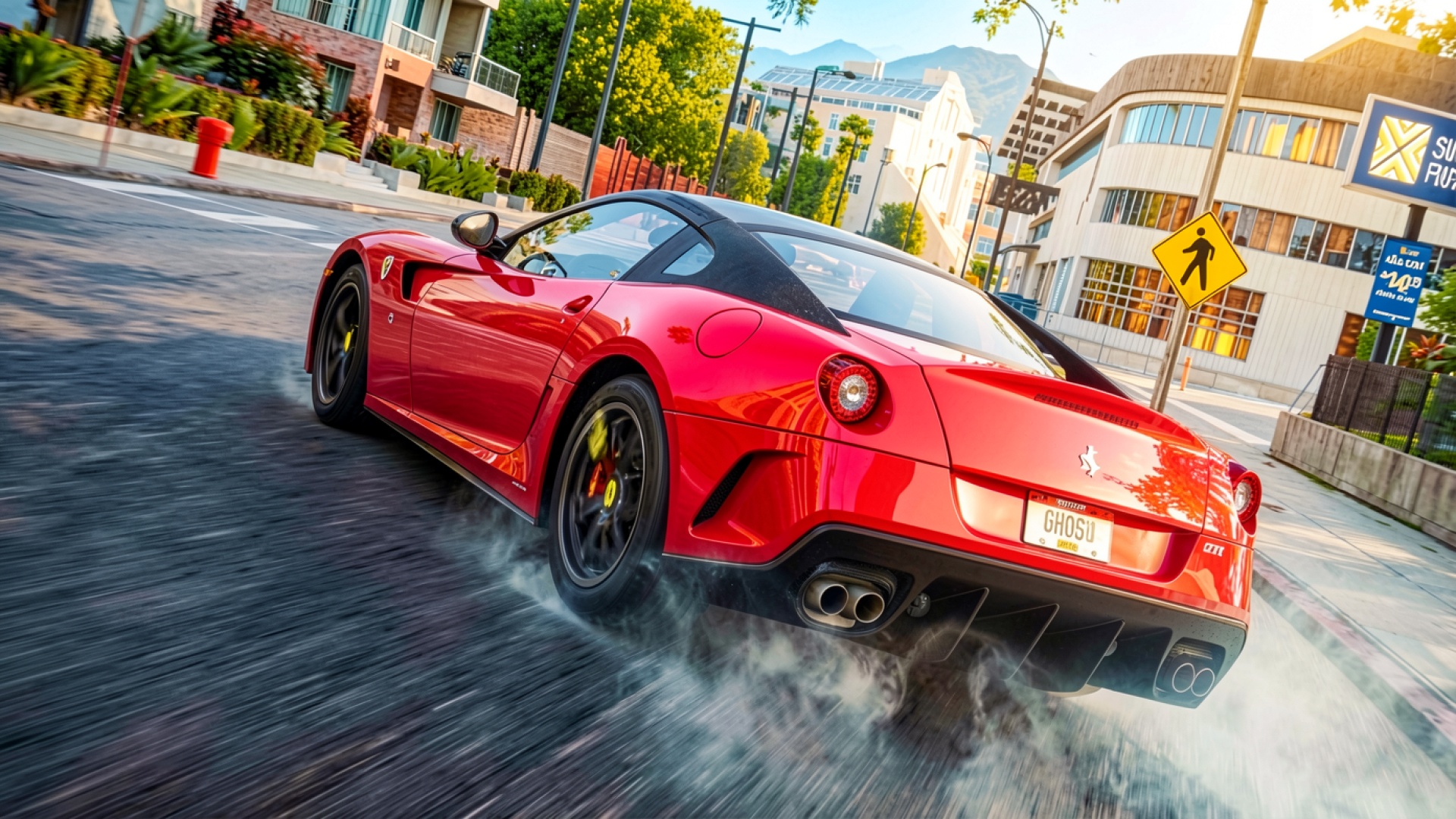 Красный спорткар Ferrari в городском дрифте