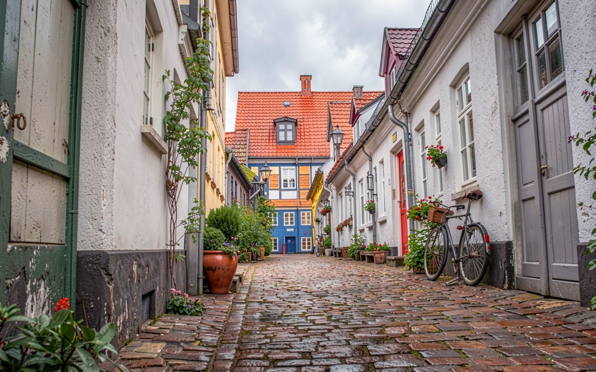Узкая мощеная улица с разноцветными домами Европы