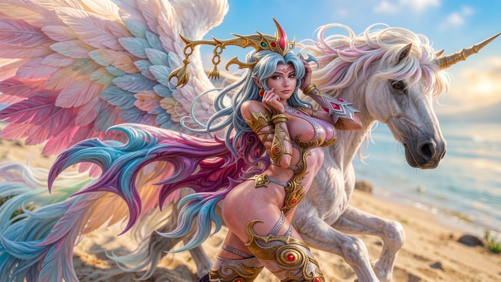 Девушка с единорогом на солнечном песчаном пляже