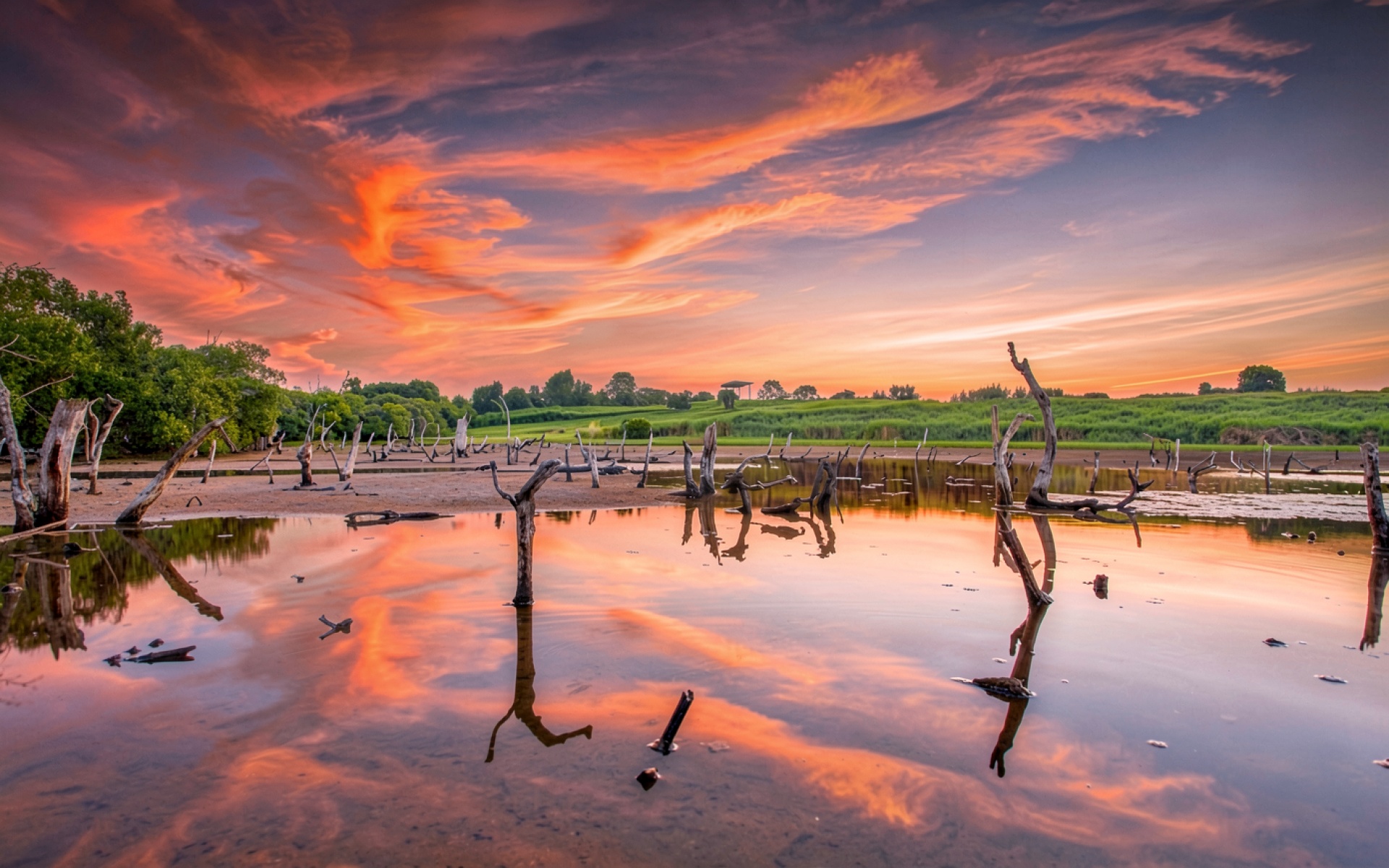 Засушливое озеро с сухими деревьями на закате