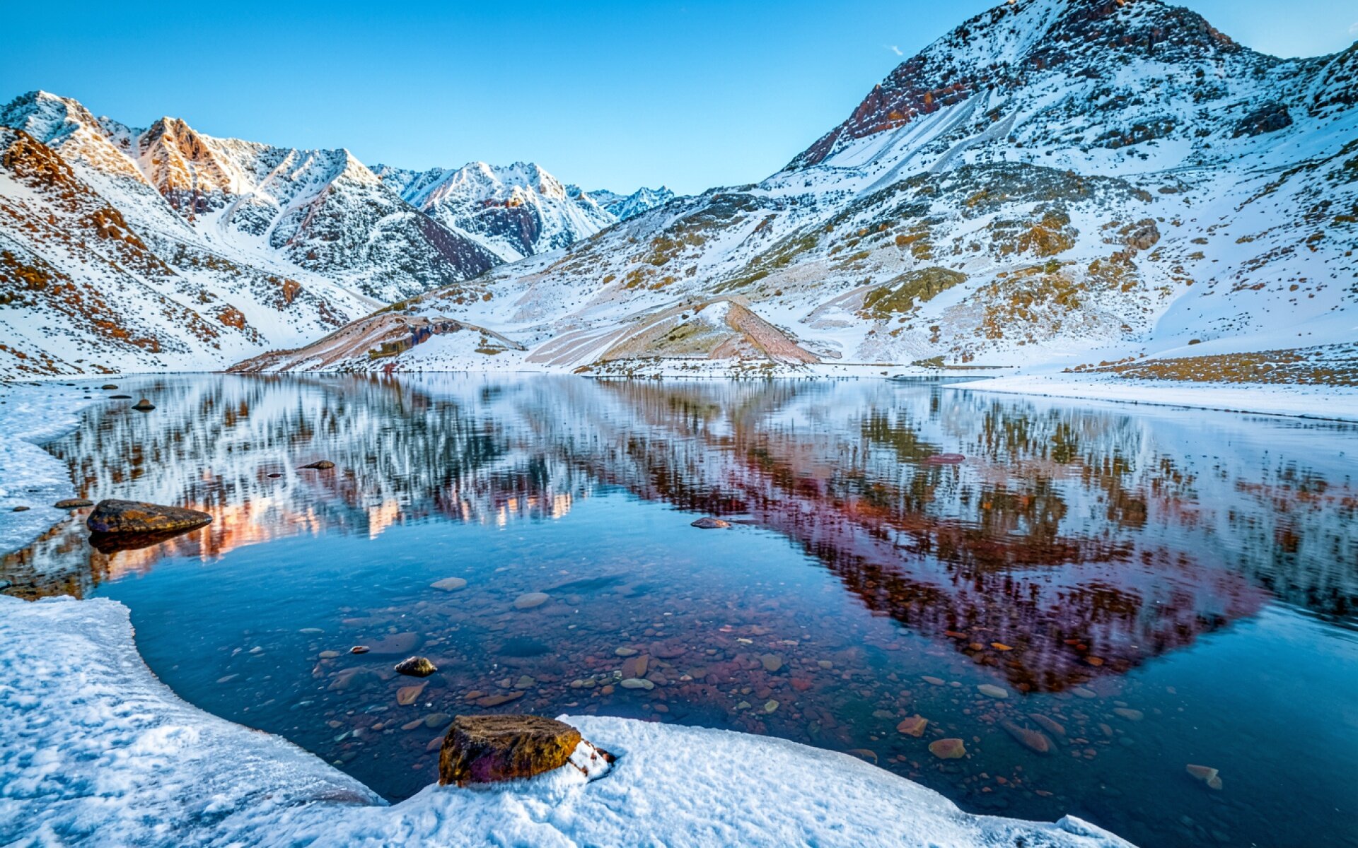 Заснеженные горы и зеркальное озеро утром