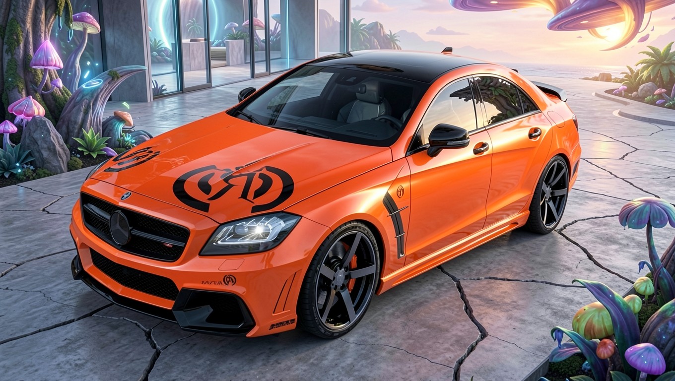 Оранжевый Mercedes Benz в сюрреалистичном инопланетном пейзаже