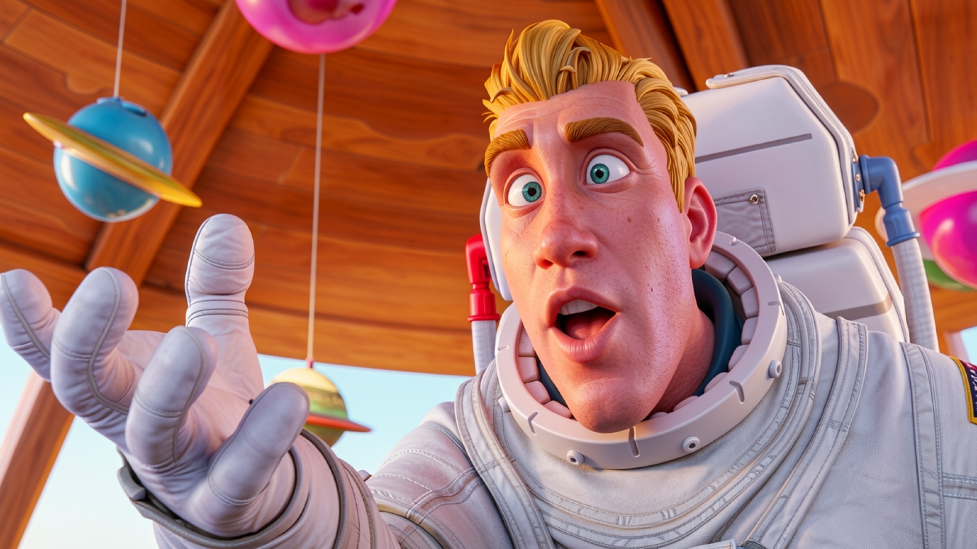 Астронавт в белом скафандре внутри деревянного интерьера