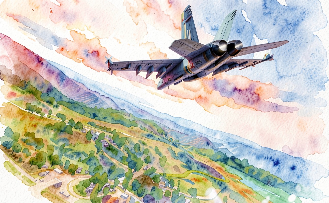 Истребитель в небе над долиной акварель