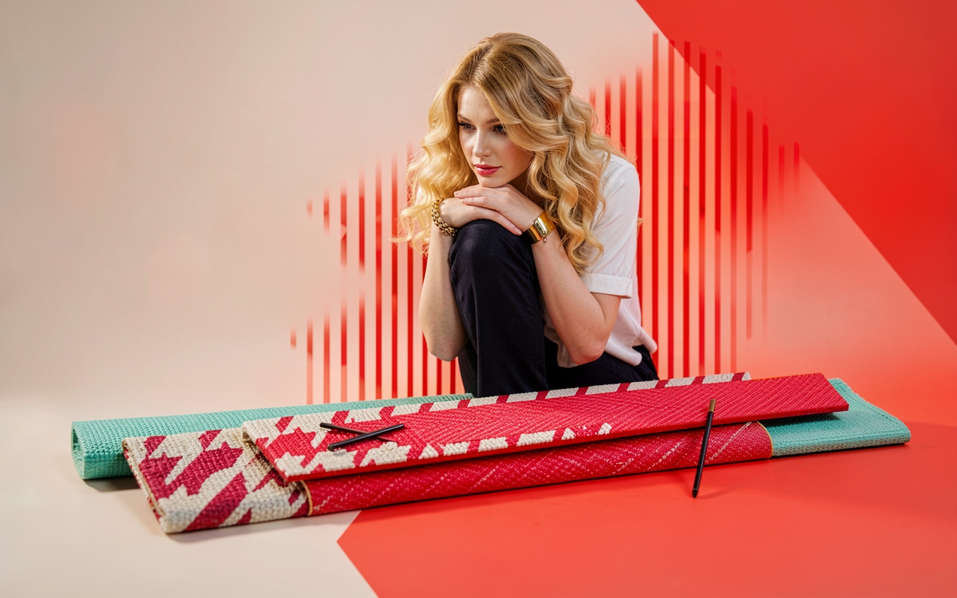 Блондинка с ковриками для йоги красного цвета
