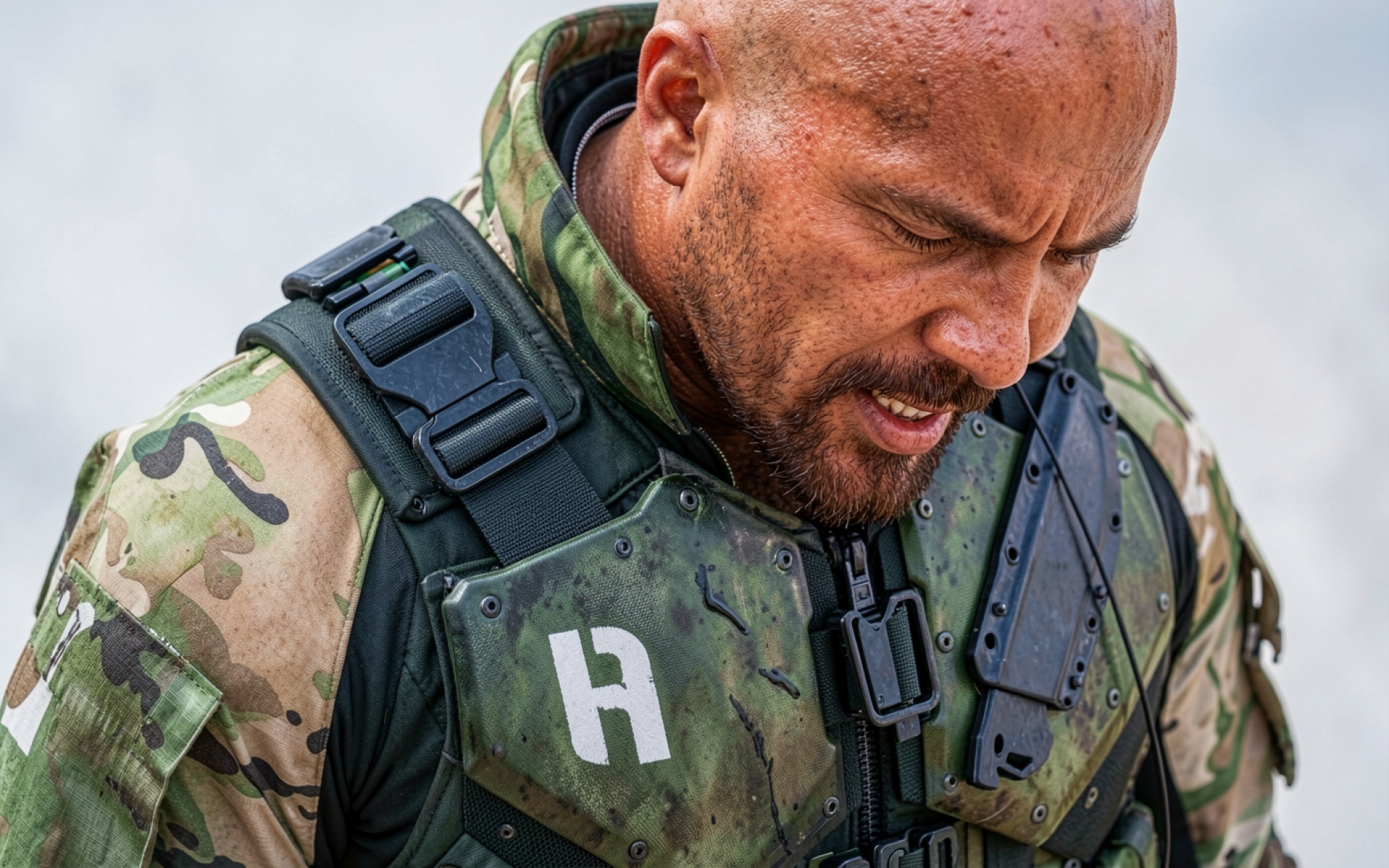 Портрет солдата в камуфляжной броне зеленого цвета