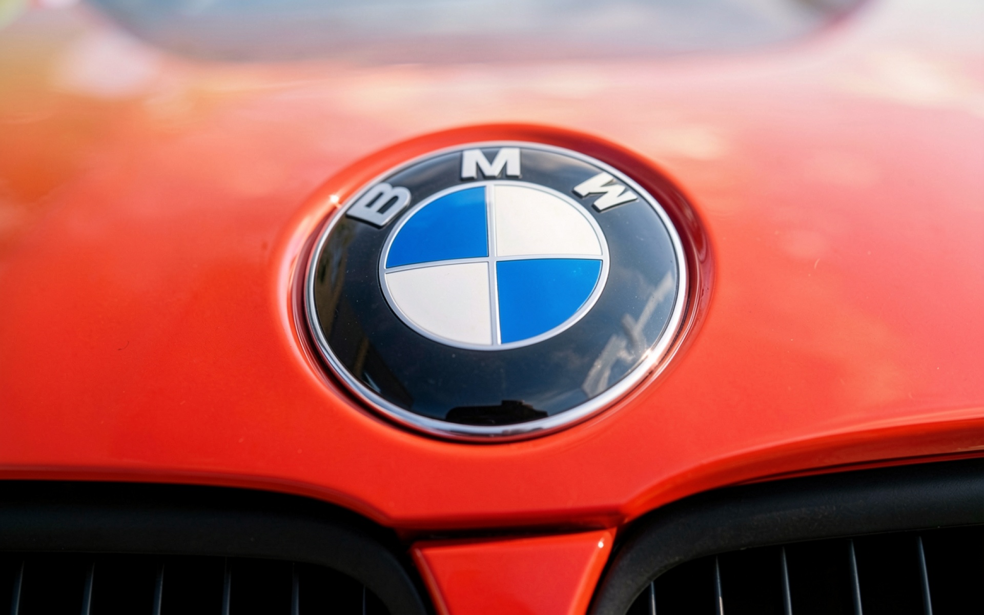 Логотип BMW на красном капоте автомобиля