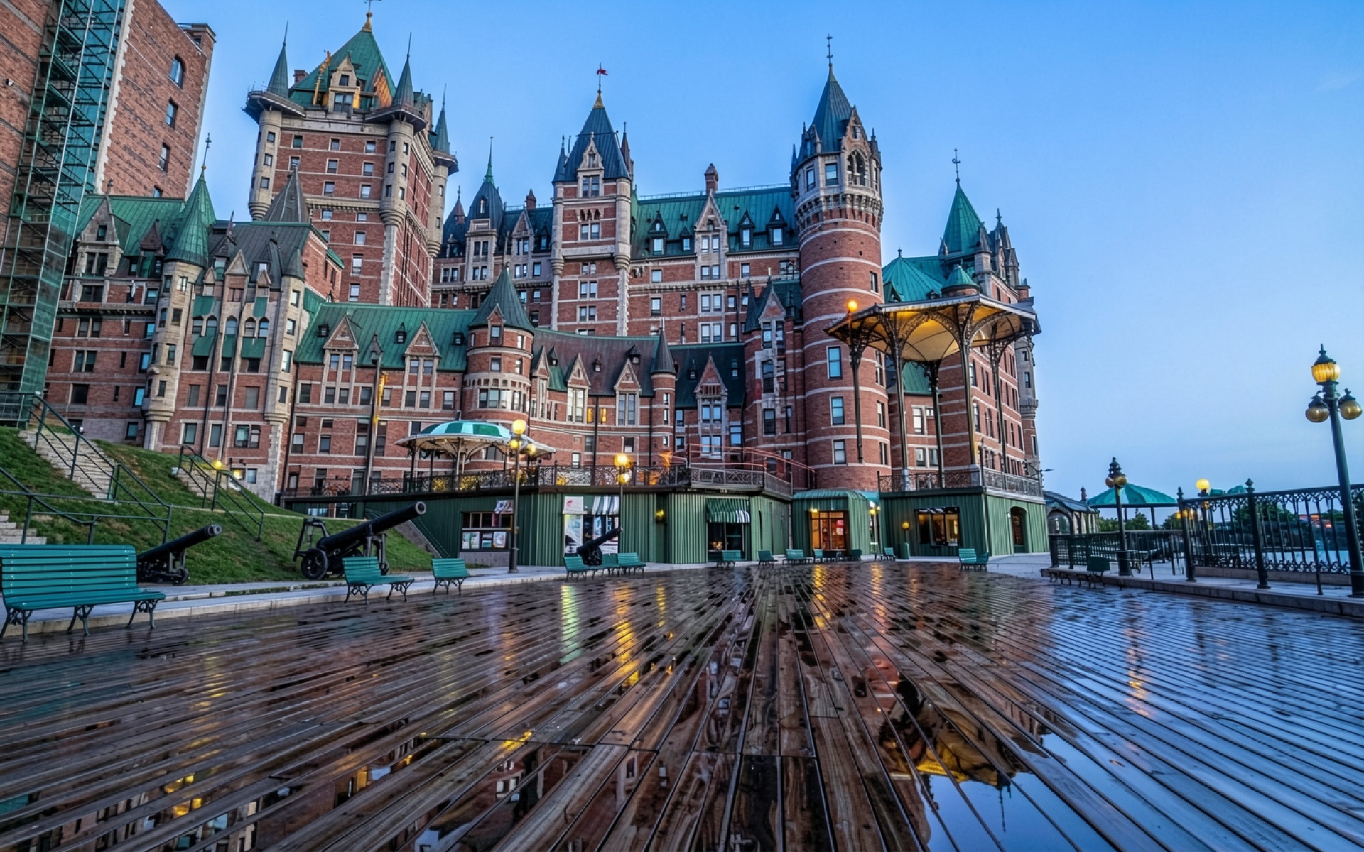 Замок Шато-Фронтенак красный кирпич сумерки город