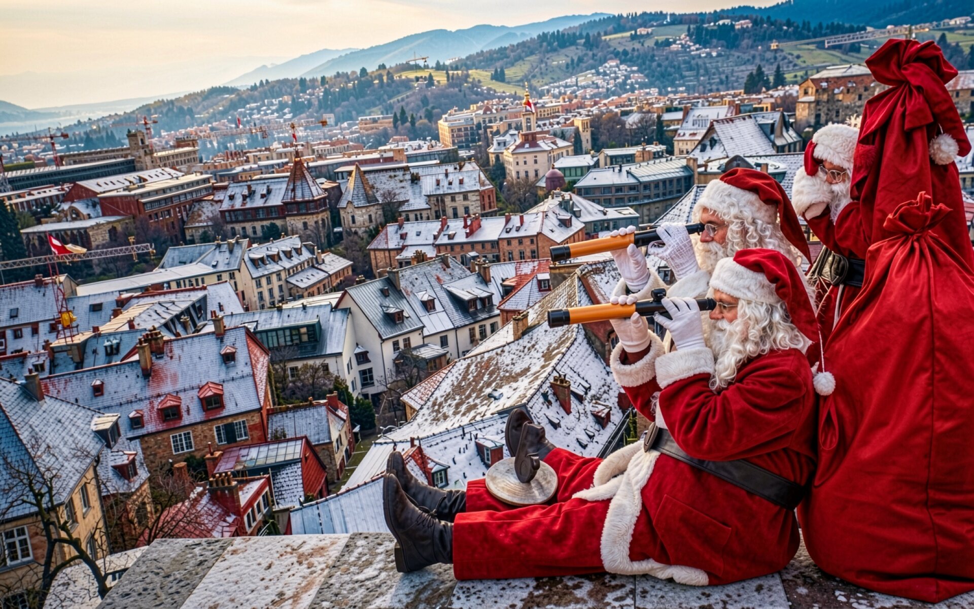 Два Санта Клауса с биноклем на крыше города