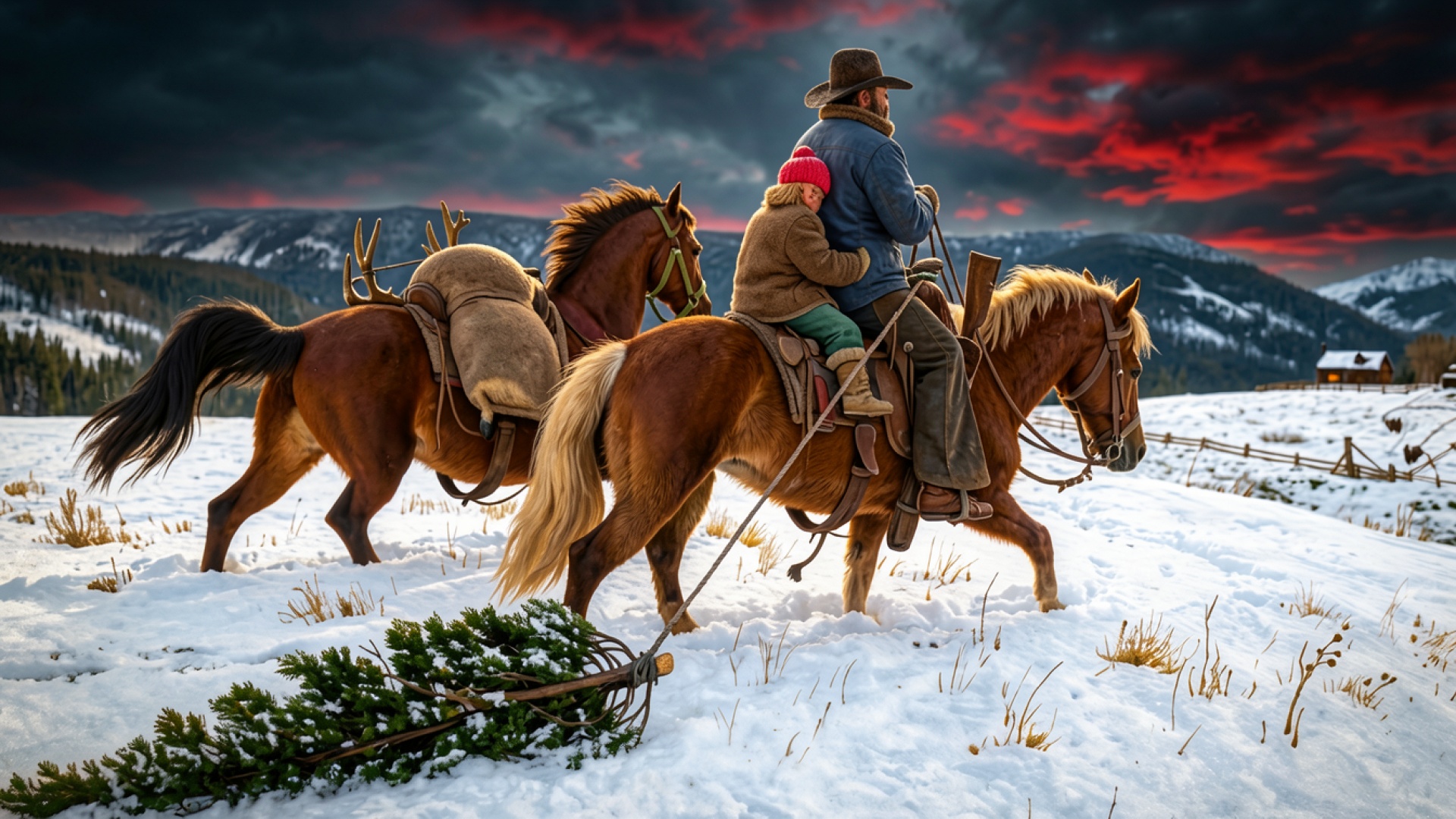 Ковбой с ребенком на лошадях в снегах