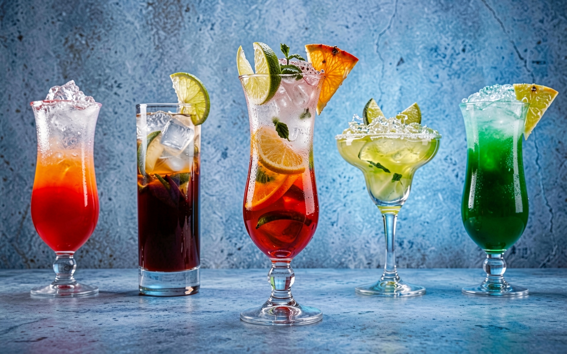 Набор разноцветных коктейлей с фруктами на синем фоне