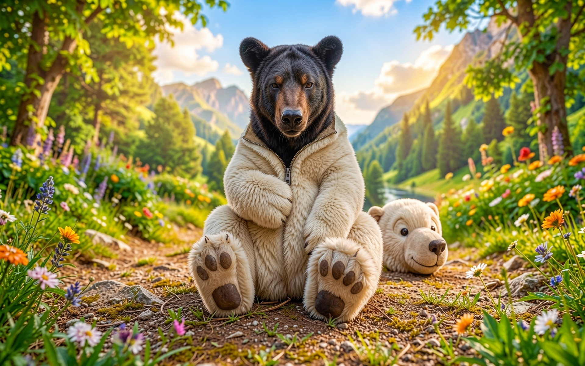 Медведи в белых комбинезонах в летнем лесу