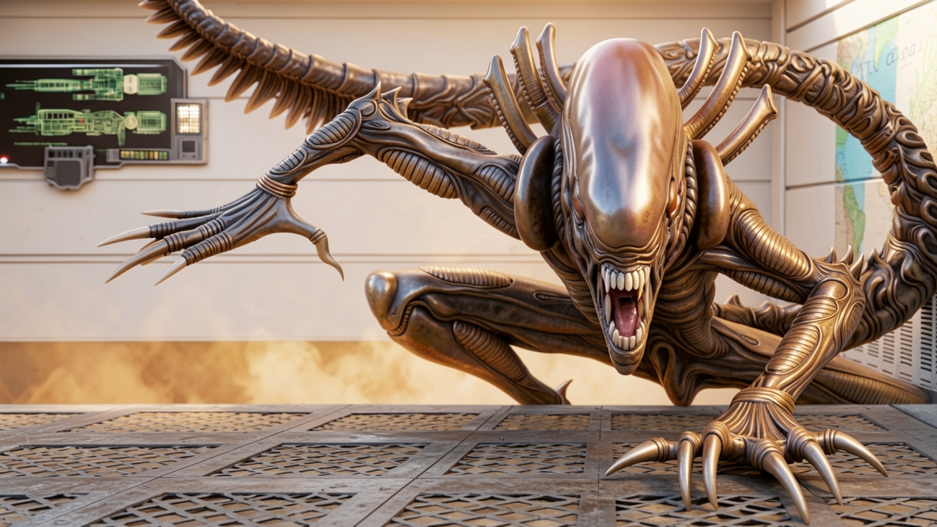 Ксеноморф золотого цвета в интерьере космического корабля